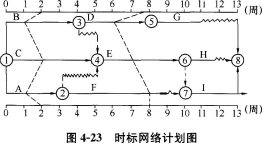 某分部工程双代号时标网络计划执行到第2周末及第8周末时,检查实际进度后绘制的前锋线如图4-23所示,图中表明( )。