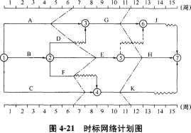 某工程双代号时标网络计划执行到第6周末和第11周末时,检查其实际进度如图4-21前锋线所示,检查结果表明( )。
