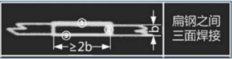 搭接方式如下图所示:扁钢与扁钢之间的连接至少需要三面施焊,搭设长度至少为扁钢宽度的2倍。