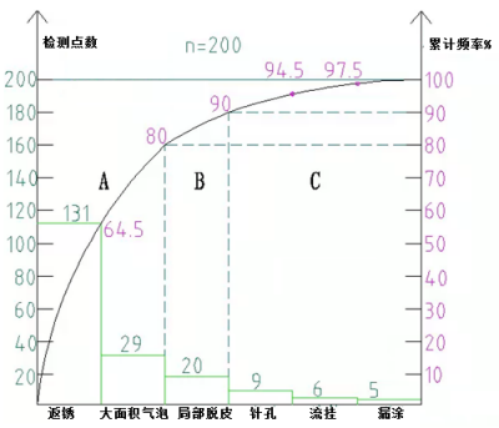 根据质检员的统计表,按排列图法,将底漆质量分别归纳为A类因素.B因素和C类因素?