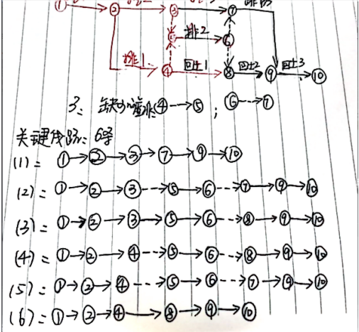 补全图1-2中缺少的虚工作(用时标网络图提供的节点代号及箭线作答,或用文字叙述,在背景资料中作答无效)。补全后的网络图中有几条关键线路,总工期为多少?