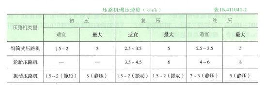 (4)振动压实应遵循“紧跟、慢压、高频、低幅”的原则,即紧跟在摊铺机后面,采用高频率、低振幅的方式慢速碾压。这是保证平整度和密实度的关键。压路机的碾压速度参照表1K411041-2规定。如发现改性沥青SMA混合料高温碾压有推拥现象,应复查其级配,且不得采用轮胎压路机碾压,以防混合料被搓擦挤压上浮,造成构造深度降低或泛油。