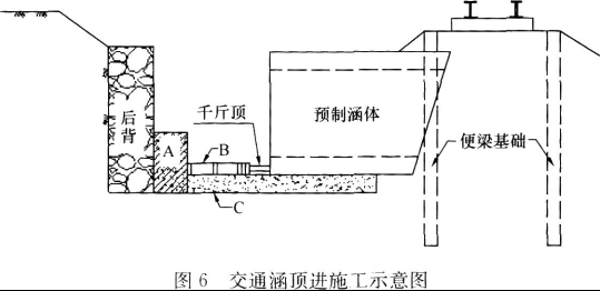 为防止扎(低)头现象发生,在滑板上预留了仰坡,在涵体底板前端预留了船头坡。交通涵顶进施工示意如