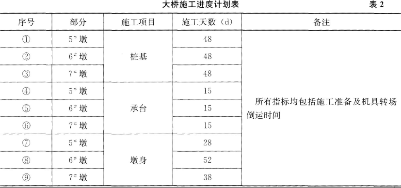 ,进度指标为1m/d。大桥施工进度计划见表2所示。计划安排施工顺序为5#墩→6#墩→7#墩,据此按表2序号