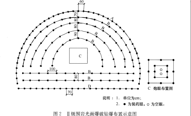 3,Ⅱ级围岩光面爆破钻爆布置示意图(如图2所示)中炮眼的起爆顺序:CBAD。