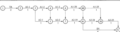 如果时间按整天考虑,各中继段的作业组正常施工,在考虑流水作业的情况下,A组的工作可以分解为 A1-n(A中继段第一作业组第n天的工作),A2-n(A中继段第二作业组第n天的工作);当A中继段光缆接续,测 试需要的时间D1=6天时,A中继段的双代号网络图如下图。