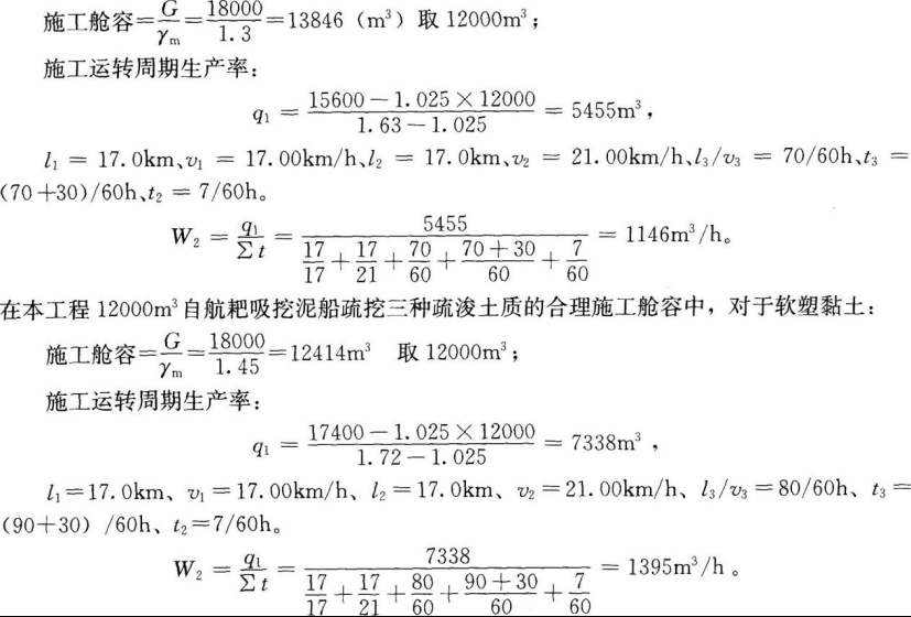 耙吸挖泥船挖、运、吹施工运转时间小时生产率可按下式计算:在本工程12000m³自航耙吸挖泥船疏挖三种疏浚土质的合理施工舱容中,对于淤泥质土:在本工程12000m³自航耙吸挖泥船疏挖三种疏浚土质的合理施工舱容中,对于松散中砂: