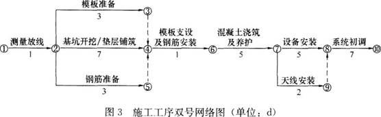 根据表2绘制出航向天线阵安装工程施工工序的双代号网络图.如图3所示。