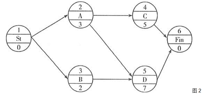 【题目解析】:单代号网络图是以节点及其编号表示工作,以箭线表示工作之间逻辑关系的网络图,并在节点中加注工作代号、名称和持续时间,以形成单代号网络计划。最早开始时间:ESC=3天;最早完成时间等于该工作最早开始时间加上其持续时间,即:EFC=ESC+DC=3+5=8(天);最迟完成时间:LFC=3+7=10(天);总时差:TFC=10-8=2(天);最迟开始时间:LSC=10-5=5(天)。