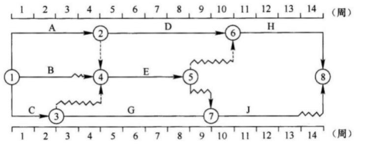 【题目解析】:以波形线表示工作与其紧后工作之间的时间间隔(以终点节点为完成节点的工作除外,当计划工 期等于计算工期时,这些工作箭线中波形线的水平投影长度表示其自由时差)。B的自由时差为1周。总时差=min【1+1+1,1+2】=3周。
