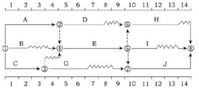 某工程双代号时标网络计划如下图所示,其中工作B的总时差和自由时差( )。
