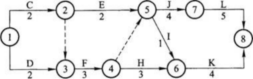 【题目解析】:工作最早开始时间等于各紧前工作的最早完成时间的最大值,题目中J工作有2项紧前工作E和 F,它们最早完成时间的分别为4天和5天,则J工作最早开始时间等于5天。J工作最早完成时间等于最早开始 时间加上其持续时间5+4=9天,故选项C正确。