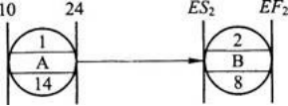 已知单代号网络计划中,工作A最早开始时间(ES)和最早完成时间(EF)分别为10天和24天,则其紧后 工作B的最早开始时间(ES2)和最早完成时间(EF2)分别为( )。