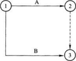【题目解析】:双代号网络图中每一项工作都必须用一条箭线和两个代号表示,若A、B两项工作的代号相同时 ,应使用虚工作加以区分。1—2代表A工作,1—3代表B工作,故选C。