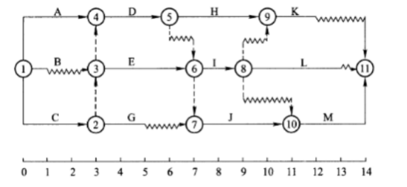 【题目解析】:自由时差可以直接在图上通过波形线得出,波形线的长度即为自由时差2。而时标网络计划中一 项工作的总时差本工作的自由时差与紧后工作总时差的最小值之和。其中以终点节点为结束节点的工作(无 紧后工作)的总时差为2。