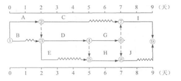 【题目解析】:以波形线表示工作与其紧后工作之间的时间间隔(以终点节点为完成节点的工作除外,当计划工 期等于计算工期时,这些工作箭线中波形线的水平投影长度表示其自由时差)。根据图中数据可以推算出:工作C的自由时差为2天,工作E的最早开始时间为第2天,工作D为关键工作,工作 H的总时差是1天,工作B的最迟完成时间是第2天,关键线路①→②→③→④→⑥→⑦→⑨。
