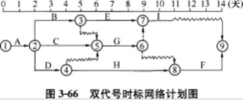 【题目解析】:以波形线表示工作与其紧后工作之间的时间间隔(以终点节点为完成节点的工作除外,当计划工 期等于计算工期时,这些工作箭线中波形线的水平投影长度表示其自由时差)。 根据时标网络图可以判断: 工作B的总时差为min{3,1+3,1+2}=3天 工作C的总时差为min{3,2}=2天 工作D为关键工作 工作E的总时差为3天 工作G的自由时差为0