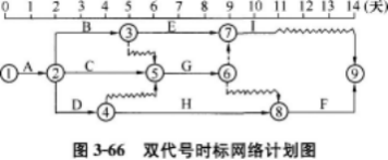 【题目解析】:以波形线表示工作与其紧后工作之间的时间间隔(以终点节点为完成节点的工作除外,当计划 工期等于计算工期时,这些工作箭线中波形线的水平投影长度表示其自由时差)。 根据时标网络图可以判断: 工作B的总时差为min{3,1+3,1+2}=3天 工作C的总时差为min{3,2}=2天 工作D为关键工作 工作E的总时差为3天 工作G的自由时差为0