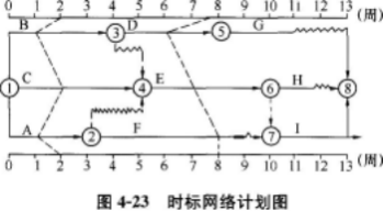 某分部工程双代号时标网络计划执行到第2周末及第8周末时,检查实际进度后绘制的前锋线如图4-23所示 ,图中表明( )。
