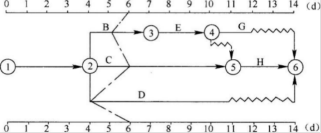 【题目解析】:本题考核的是前锋线比较法进行实际进度与计划进度的比较。第6天结束时,工作B拖后1D,不影响工期,因为其总时差为1D;工作C实际进度正常;工作D拖后2D,其总时差为3D,不影响工期;工作B拖后1D,将使工作E的最早开始时间推迟1D,其总时差为0;工作G的总时差尚有1D。