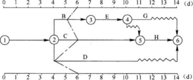 【题目解析】:本题考核的是前锋线比较法进行实际进度与计划进度的比较。第6天结束时,工作B拖后1D,不影响工期,因为其总时差为1D;工作C实际进度正常;工作D拖后2D,其总时差为3D,不影响工期;工作B拖后1D,将使工作E的最早开始时间推迟1D,其总时差为0;工作G的总时差尚有1D。