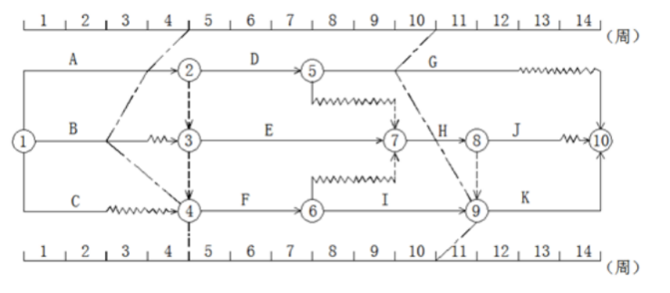 【题目解析】:“第4周末检查时工作A拖后1周,但不影响总工期”错误,关键线路有两条:1-2-3-7-8-9-10;1-2-3-4-6-9-10,在第四周检查时,A工作拖后一周,因为A工作在关键线路上,因此,将影响总工期1周。“第4周末检查时工作C拖后1周,影响总工期1周”错误,在第4周末检查,C工作正常进行。第10周末检查时,工作G拖后1周,因G有两周的总时差,因此不会影响总工期。“第10周末检查时工作G拖后1周,将影响总工期1周”错误,第10周末检查时,工作I提前一周,但是工作H正常,因此工期不会提前。