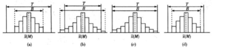 【题目解析】:在图(d)中,B在T中间,质量分布中心与质量标准中心M正好重合,两侧还有一定余地,表明 工序质量稳定,不会出废品。