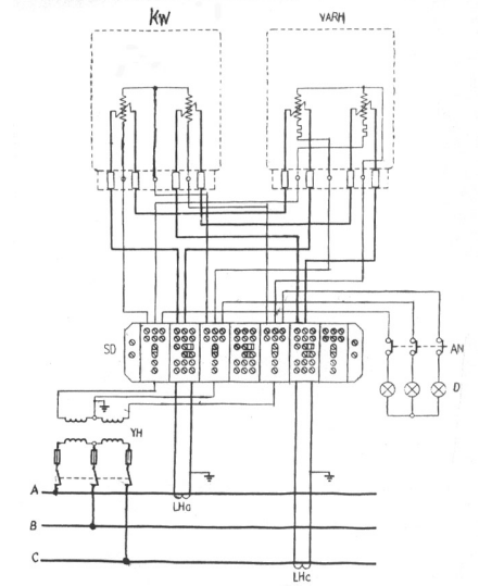 22. 试画出三相二元件有、无功电能表,带TV、TA和接线盒的联合接线图。