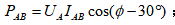 若在AB相间接入单相电焊机,其功率因数为cosΦ,C相无负荷,这时通过第一只电能表的功率为