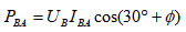 。当电焊机的功率因数cosΦ低于0.5(即Φ>60°)时,UB与IAB的夹角将大于90°,则PBA为负值,第二只电能表将反转,电焊机消耗的有功电度为两只单相表读数的代数和。
