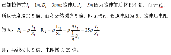 一直径为3mm,长为1m的铜导线,被均匀拉长至5m(设体积不变),求电阻是原电阻的几倍?