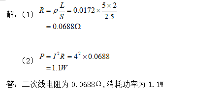 ,求20℃时,二次线总电阻为多少?若TA二次电流为4A,问二次线消耗的功率为多少?(20℃时ρ=0.0172)