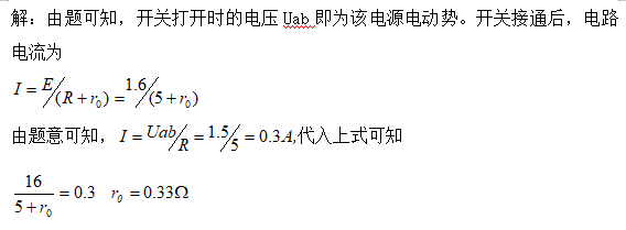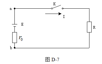 22. 如图D-7所示,已知R=5Ω,开关K打开时,电源端电压Uab为1.6V;开关K闭合后,电源端电压Uab变为1.50V,求该电源的内阻r。