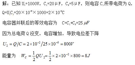 有一个20μF的电容器,充电到1000V后,再使它与一个未充电的5μF的电容器相并联,试求总电容的电位差和具有的能量