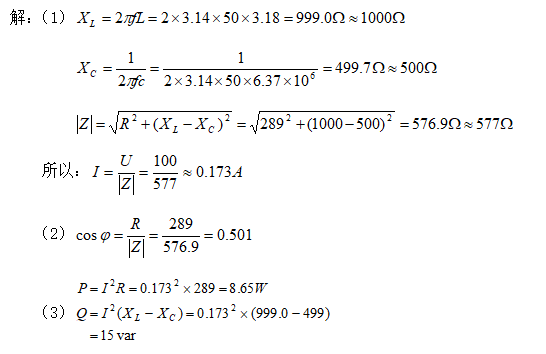 有一个RCL串联电路,电阻289Ω,电容C=6.37μF;电感L=3.18H,当将它们作为负载接电压为100V,频率为50