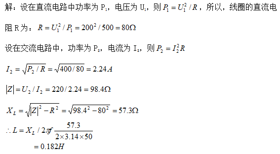 将某电感线圈接入200V直流电压时,线圈消耗的功率是500W;当将它接于电压为220V,频率为50HZ的交流电路时,线圈消耗的功率是400W,求该线圈的电阻R和电感L。