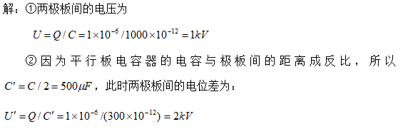 一个平行板空气电容器,容量是1000PF,每一极板上的电荷只1μF,问①两极板间的电位差有多大?②如果维持电荷不变,仅将其板间距离加大一倍,这时两极板间的电位差是多少?