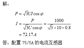 某工厂有功负荷1000kW,功率因数 ,10kV供电,高压计量,求需配置多大的电流互感器?