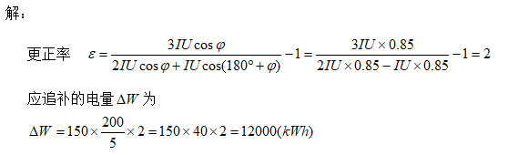 某三相低压用户,安装的是三相四线有功电能表,计量TA变比为200/5A,装表时计量人员误将U相TA极性接反,故障期间抄见表码为150kWh,表码启码为0,试求应追补的电量(故障期间平均功率因数为0.85)。