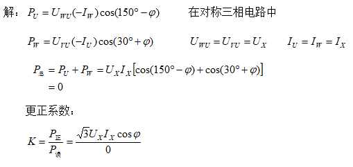 ,请写出两元件功率表达式和总功率表达式,以及计算出更正系数K,(三相负载平衡)