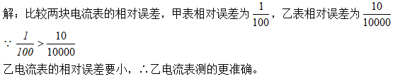 用甲电流表测量电流时,测量结果为100mA,测量误差为1mA,用乙电流表测量另一个电流,测量结果为10A,测量误差为10mA,问哪块电流表测量结果更准确些?
