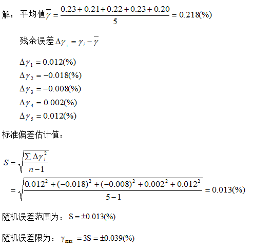 用一台电能表标准装置测定一只短时稳定性较好的电能表某一负载下的相对误差,在较短的时间内,在等同条件下,独立的测量5次,所得的误差数据分别为:0.23%,0.20%,0.21%,0.22%,0.23%试计算该装置的单次测量标准偏差估计值和最大可能的随机误差。