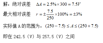 用2.5级电压表的300V档,在额定工作条件下测量某电压值,其指示值为250.0V,试求测量结果可能出现的最大相对误差,并指出实际值的范围。