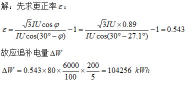 某三相高压用户,安装的是三相三线两元件有功电能表,TV、TA均各采用二个TV、二个TA的接线,在进行电气予试时将计量TV高压A相保险熔断,错误计量期间平均功率因数为0.89,抄见表码为80kWh电能表的启码为0,该户TV变比为6kV/0.1kV,CT变比为200/5A,试求应追补的电量。