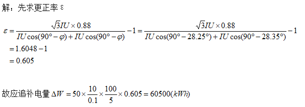 某三相高压电力用户,三相负荷平衡,在对其计量装置更换时,误将C相电流接入表计A相,负A相电流接入表计C相,已知故障期间平均功率因数为0.88,故障期间表码走了50个字,若该户计量TV比为10000/100V,TA比为100/5A,试求故障期间应追补的电量。