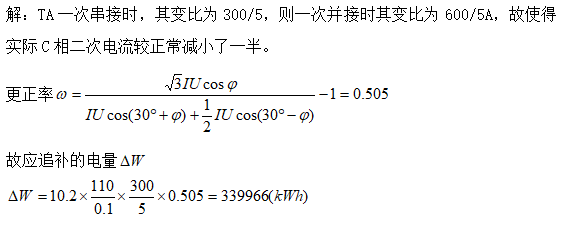 某110kV供电的用户计量装置安装在110kV进线侧,所装TA可通过改变一次接线方式改变变比,在计量装置安装中要求一次串接,其计量绕组变比为300/5,由于安装人员粗心误将C相TA一次接成并联方式,投运5天后,5天中有功表所计码为10.2(起始表码为0),试计算应退补的电量。(故障期间平均功率因数为0.86)