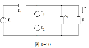 如图D-10所示,E1和E2是理想电压源,E1=10V,E2=20V,IS是理想电流源,IS=5A, R1=2Ω,R2=100Ω,R=80Ω,求负载电流I。