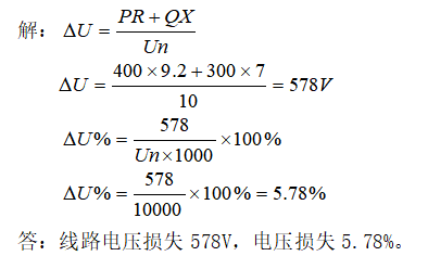 某条线路长度为20km,导线是LJ—70,电压10kV,输送有功功率为400kW,无功功率为300kvar时,求线路电压损失和电压损失百分数,(查手册,R=9.2Ω,X=0.35Ω/km×20=7Ω)