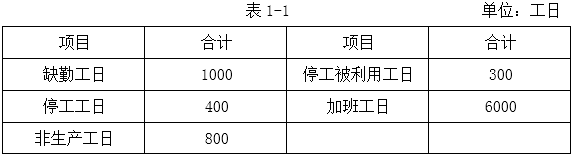 【题目解析】:(1)日历工日数=月平均人数×日历时间=2000×30=60000(工日) (2)公假工日数=月平均人数×制度公休日=2000×8=16000(工日) (3)制度工日数=日历工日数-公假工日数=60000-16000=44000(工日) (4)出勤工日数=制度工日数-缺勤工日数=44000-1000=43000(工日) (5)制度内实际工作工日数=出勤工日-非生产工日-停工工日+停工被利用工日 =43000-800-400+300=42100(工日) (6)全部实际工日数=制度内实际工作工日+加班加点工日=42100+6000=48100(工日)